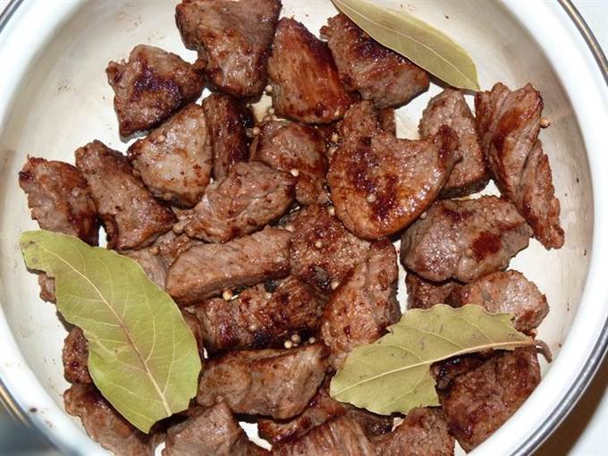 Поджаренное мясо сложить в кастрюльку, добавить лавровый лист и кориандр, пару горошин черного перца. Залить кипятком, чтобы вода была на 1 см выше мяса и варить 35 минут. Затем извлечь лавровый лист.