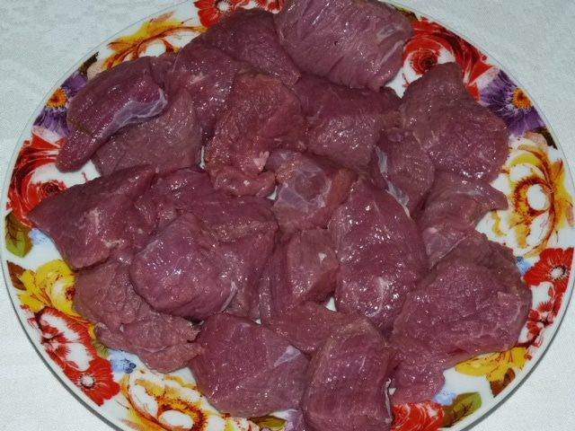 Телятину порезать на кусочки. Обжарить со всех сторон на растительном масле до тех пор, пока не испарится лишняя жидкость, которая появилась при жарке мяса. У меня на это ушло 20 минут.