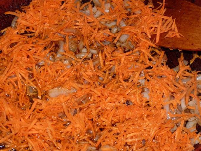 Тем временем в масле из-под мяса обжариваем лук до подрумянивания, добавляем морковь и жарим пару минут, помешивая.