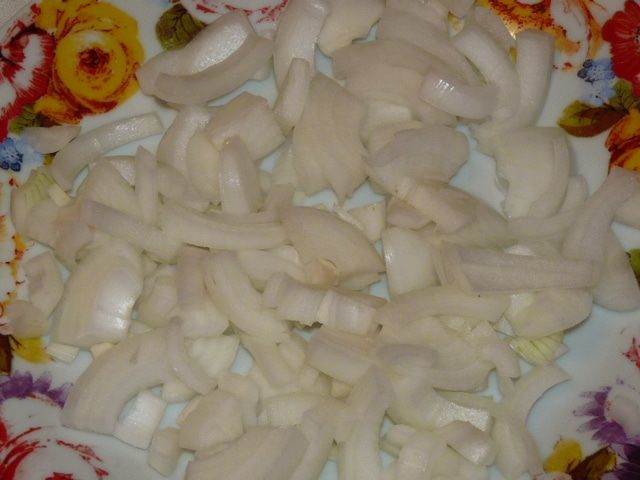 Тем временем лук нарезать полукольцами. Морковь натереть на терке.