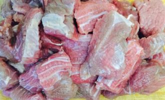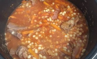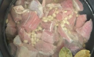 Кладем в мультиварку мясо и фасоль, добавляем соль, лавровый лист и наливаем воду на один см выше. Ставим на режим тушение на один час.