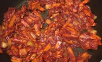 Нарезаем соломкой морковь, лук и обжариваем на среднем огне в течение трех минут. Затем добавляем томатную пасту и измельченный чеснок и еще обжариваем полминуты.