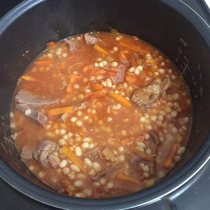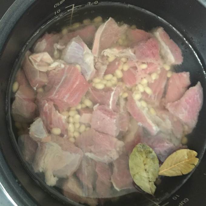 Кладем в мультиварку мясо и фасоль, добавляем соль, лавровый лист и наливаем воду на один см выше. Ставим на режим тушение на один час.