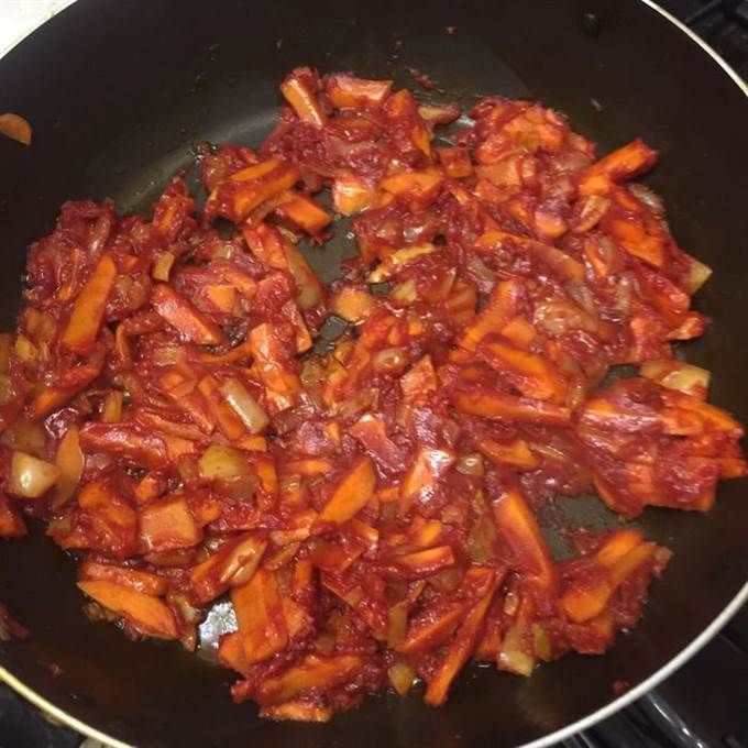 Нарезаем соломкой морковь, лук и обжариваем на среднем огне в течение трех минут. Затем добавляем томатную пасту и измельченный чеснок и еще обжариваем полминуты.
