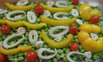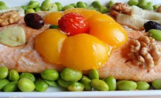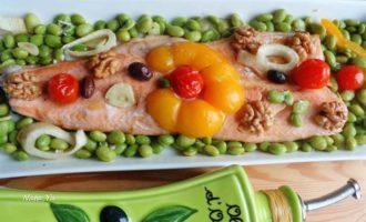 Готовую рыбу выложить на сервировочное блюдо, вокруг выложить овощи.