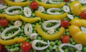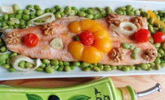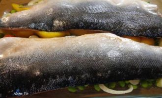 Выложить рыбу в форму поверх овощей, шкуркой вверх. И отправим в разогретую до 200°С духовку на 25 — 30 минут.