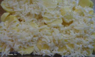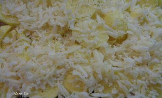 Сверху присыпать картофель тертым на крупную терку сыром.
