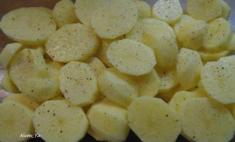 Картофель очистим от кожуры и нарежем кружочками. Будем выкладывать картофель в форму, каждый слой присыпая солью и через слой — молотым перцем. И так до самого верха формы.