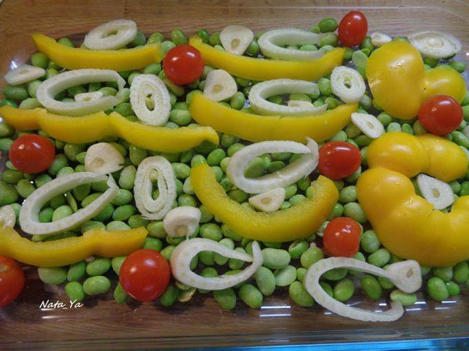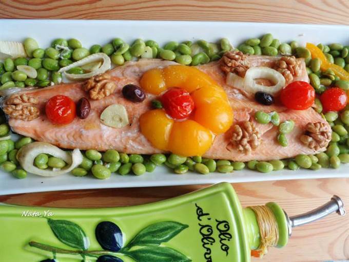 Готовую рыбу выложить на сервировочное блюдо, вокруг выложить овощи.