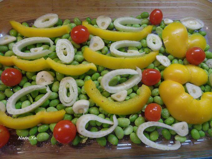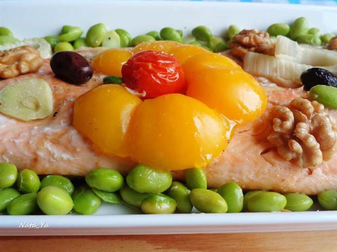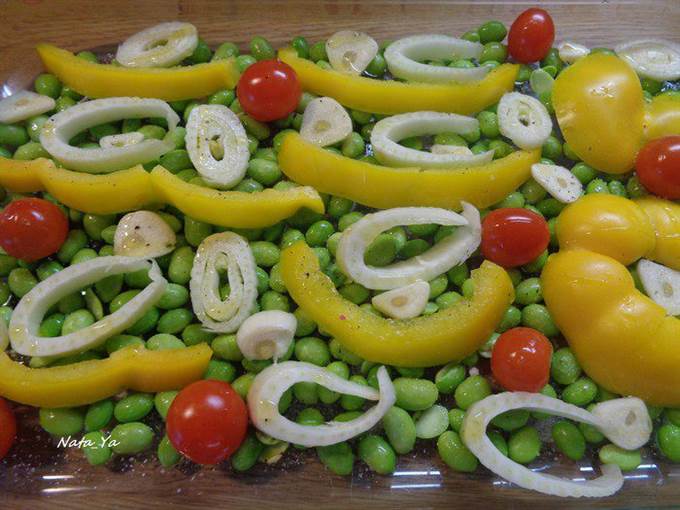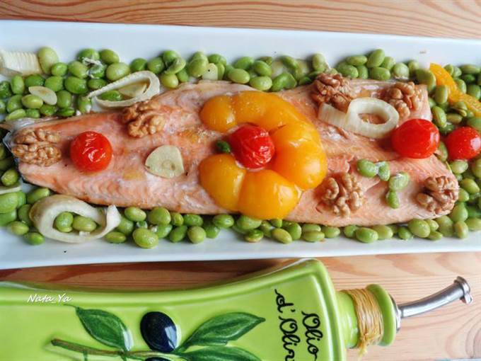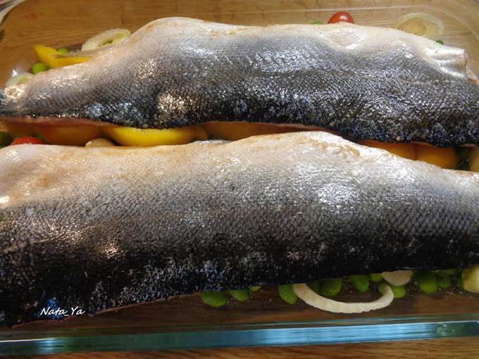 Выложить рыбу в форму поверх овощей, шкуркой вверх. И отправим в разогретую до 200°С духовку на 25 — 30 минут.