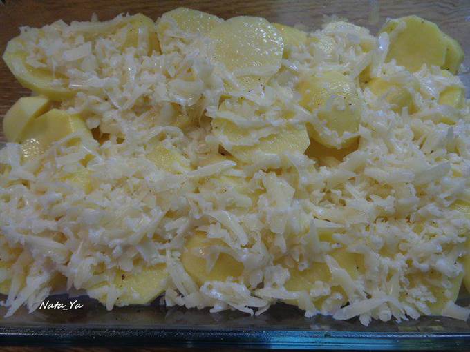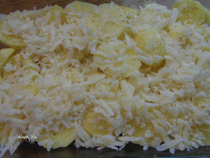 Сверху присыпать картофель тертым на крупную терку сыром.