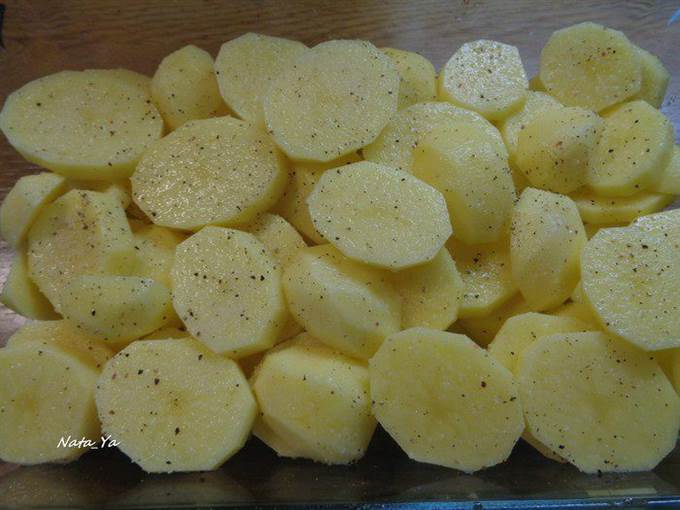 Картофель очистим от кожуры и нарежем кружочками. Будем выкладывать картофель в форму, каждый слой присыпая солью и через слой — молотым перцем. И так до самого верха формы.