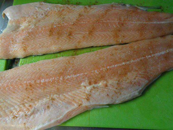 Рыбу с двух сторон посолить и присыпать молотой паприкой.