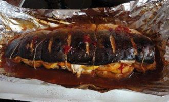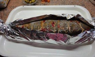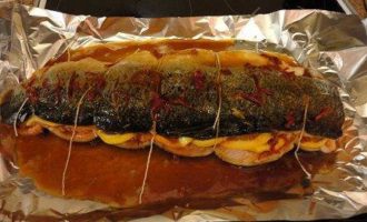 • Достать рыбу из холодильника и подождать, пока она не достигнет комнатной температуры. Полить рыбу еще раз маринадом и потом обернуть ее фольгой так, чтобы верх остался открытым. Разогреть духовку до 200 градусов и запекать 45 минут.