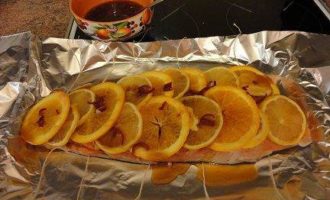 • Положить первый кусок филе на фольгу. Нарезать 2-й лимон и апельсин дольками, выложить их на филе и немного полить маринадом.