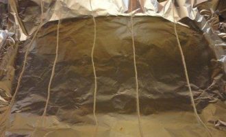 • Обсушить филе лосося с помощью бумажных полотенец и сделать несколько глубоких надрезов на коже. Фольгу положить на лист для запекания и на него нитки, которыми будете перевязывать рыбу.