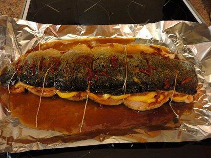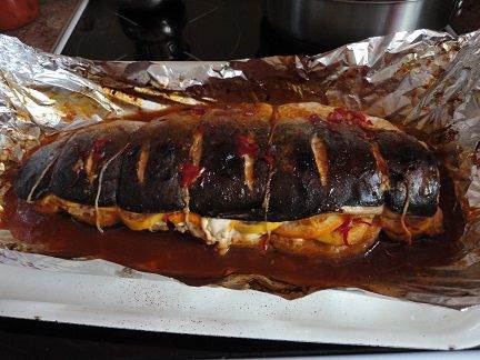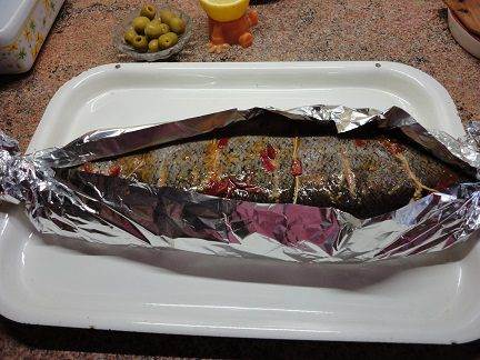 • Достать рыбу из холодильника и подождать, пока она не достигнет комнатной температуры. Полить рыбу еще раз маринадом и потом обернуть ее фольгой так, чтобы верх остался открытым. Разогреть духовку до 200 градусов и запекать 45 минут.