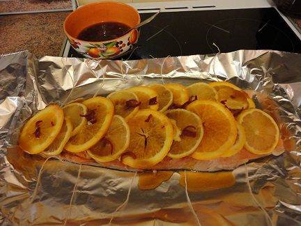 • Положить первый кусок филе на фольгу. Нарезать 2-й лимон и апельсин дольками, выложить их на филе и немного полить маринадом.