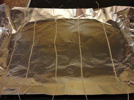 • Обсушить филе лосося с помощью бумажных полотенец и сделать несколько глубоких надрезов на коже. Фольгу положить на лист для запекания и на него нитки, которыми будете перевязывать рыбу.