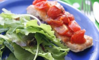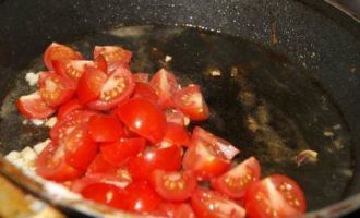 Тем временем приготовить соус. Чеснок раздавить ножом, мелко нарещать, обжарить в небольшом количестве оливкового масла. Помидорки порезать на 4 части, добавить к чесноку потушить 5 минут, добавить смесь прованских трав.