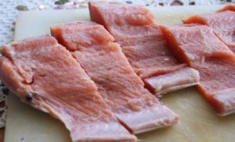 Рыбу порезать кусочками. Посолить, сбрызнуть соком лимона.