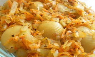Сверху укладываем обжаренные лук с морковью.