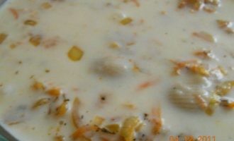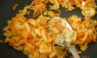 Лук и морковь обжариваем на оливковом масле, добавляем туда все приправы!