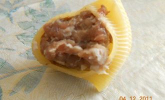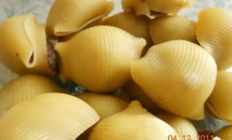 Берем лумакони (сырые), и нафаршировываем их сырым фаршем.