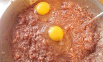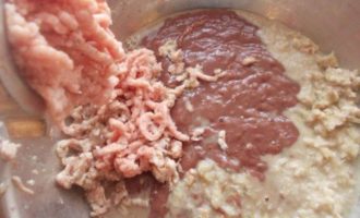 Всыпать овсянку в фарш, посолить, поперчить, добавить яйца и хорошенько перемешать. Оставить на час, за это время овсяные хлопья разбухнут и фарш станет гуще.