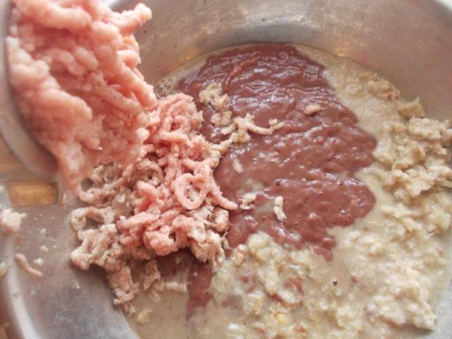К печени помолоть лук, чеснок и мясо. Лучше, чтобы свинина была с жирком.