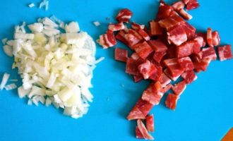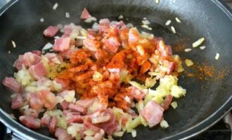 Нарезанные лук и бекон обжарить на среднем огне до мягкости лука, в конце всыпать паприку, перемешать и через минуту убрать с огня и поддерживать теплыми.