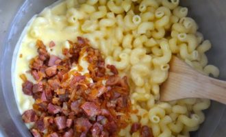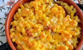 Отваренные макароны смешать с сырным соусом и луком с беконом, выложить в смазанную маслом форму для запекания, посыпать оставшимся сыром (чеддер и пармезан)…