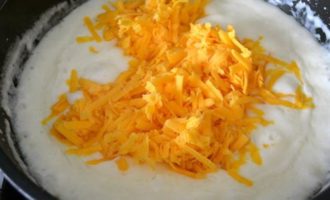 В другой сковороде или сотейнике приготовить соус бешамель: растопить сливочное масло и обжарить муку на среднем огне за пару минут, вливая порциями горячее молоко, уварить соус, постоянно помешивая на слабом огне. Помешивая, в готовый соус всыпать чеддер (отложив горсть для присыпки), дать сыру расплавиться, посолить и поперчить по вкусу.