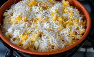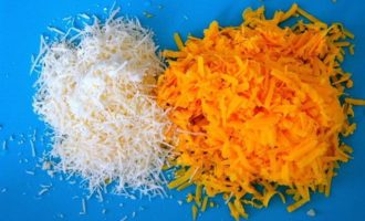 Тем временем оба вида сыра натереть на терке (чеддер я натерла более крупно, а пармезан более мелко, но это не принципиально).