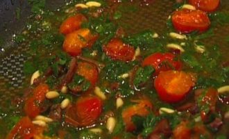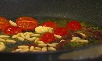 Выложить в сковороду к чесноку помидоры, оливки вместе с заправкой и кедровые орехи и обжаривать 1-2 минуты.