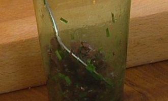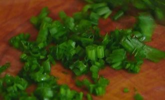 Шнитт-лук мелко порубить или нарезать ножницами. Растереть шнитт-лук в ступке со щепоткой соли и перца.