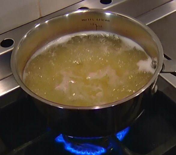 Отварить макароны в подсоленной воде, затем воду слить и сохранить.