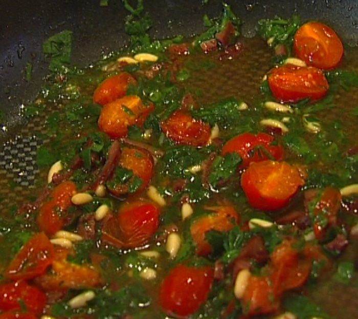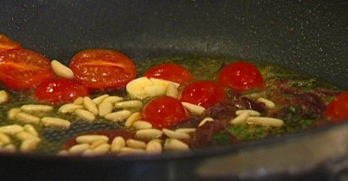 Выложить в сковороду к чесноку помидоры, оливки вместе с заправкой и кедровые орехи и обжаривать 1-2 минуты.