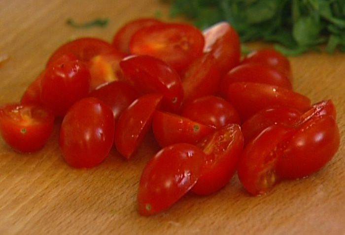 Помидоры черри разрезать пополам.