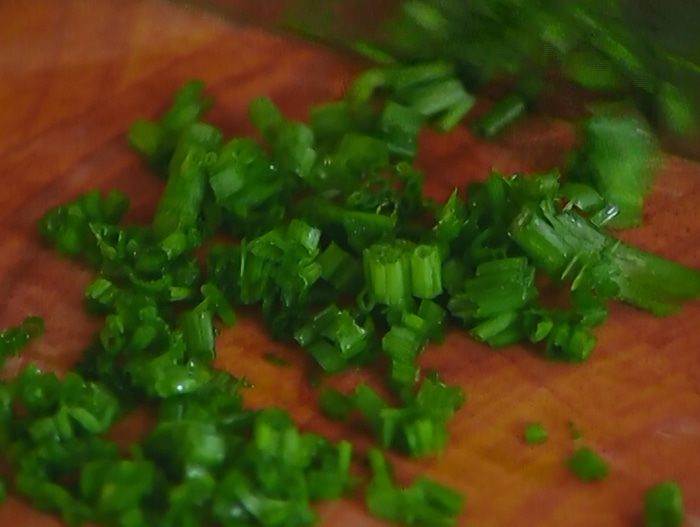 Шнитт-лук мелко порубить или нарезать ножницами. Растереть шнитт-лук в ступке со щепоткой соли и перца.