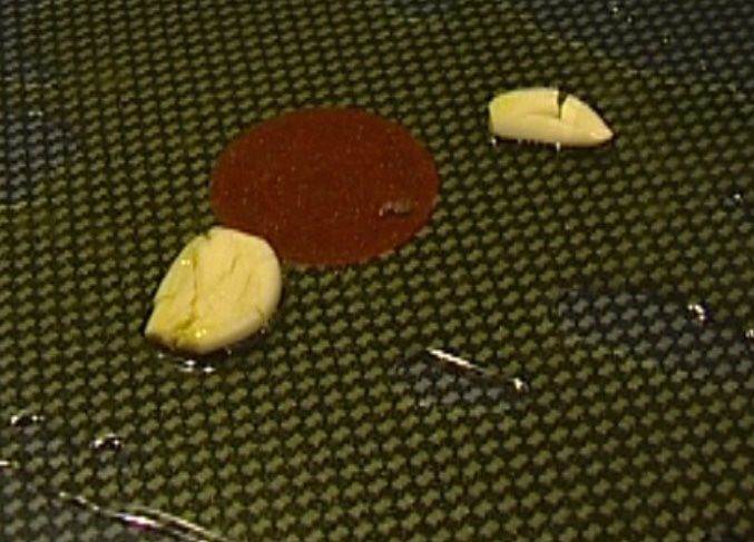 Разогреть в сковороде оливковое масло и слегка обжарить чеснок.