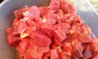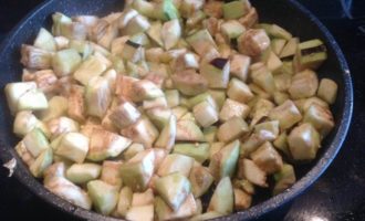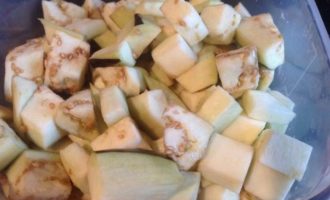 Баклажаны очистите, нарежьте кубиками, посолите и оставьте на 10-15 минут.