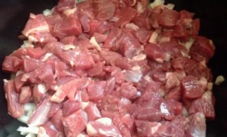 Добавьте баранину и жарьте, пока не подрумянится, посолите, приправьте специями заатар (1 ст.л.), добавьте чеснок.