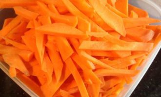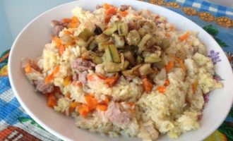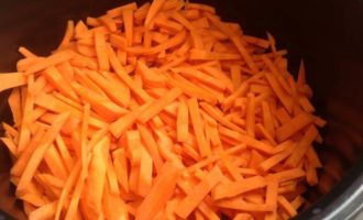 Дальше можно готовить двумя способами: продолжать готовить в сковороде или готовить в мультиварке. Выровнить слой мяса, выложить слоями морковь, цветную капусту и рис.