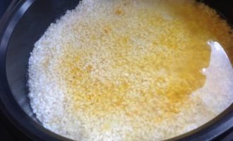Залейте 1 л воды, присыпьте куркумой, уменьшите огонь, накройте крышкой и варите, пока не выпарится вся вода. Если вы будете готовить в мультиварке, то установите программу «Плов» и время 45 минут.