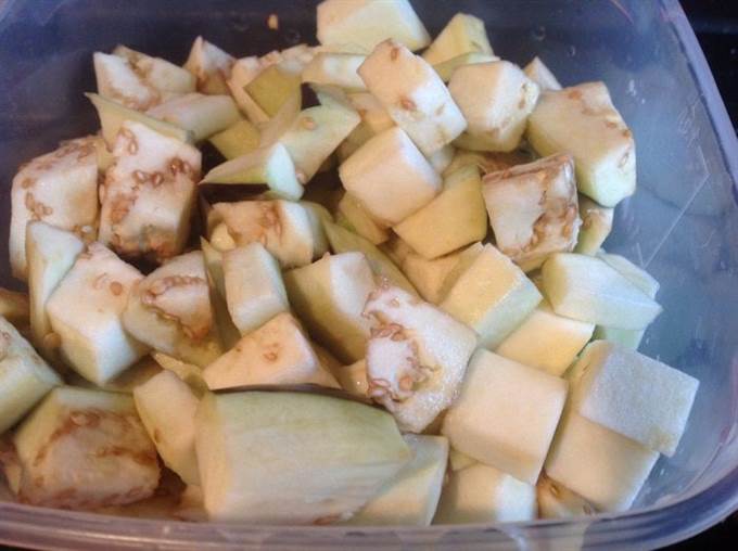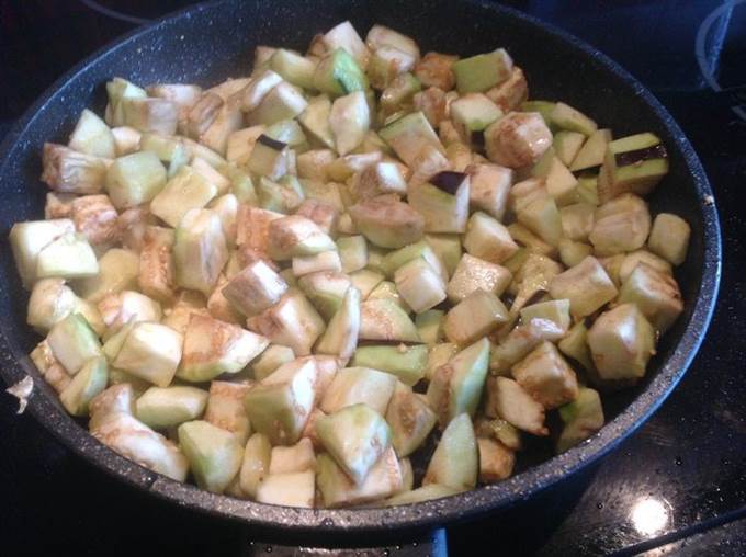 Баклажаны очистите, нарежьте кубиками, посолите и оставьте на 10-15 минут.