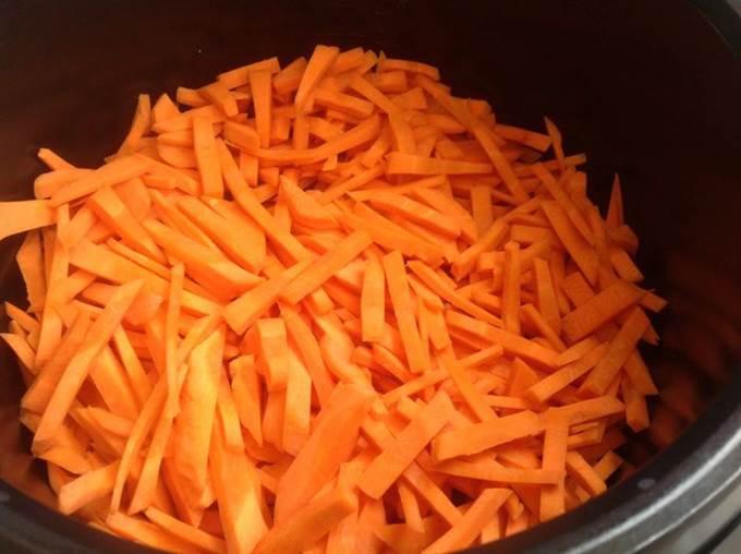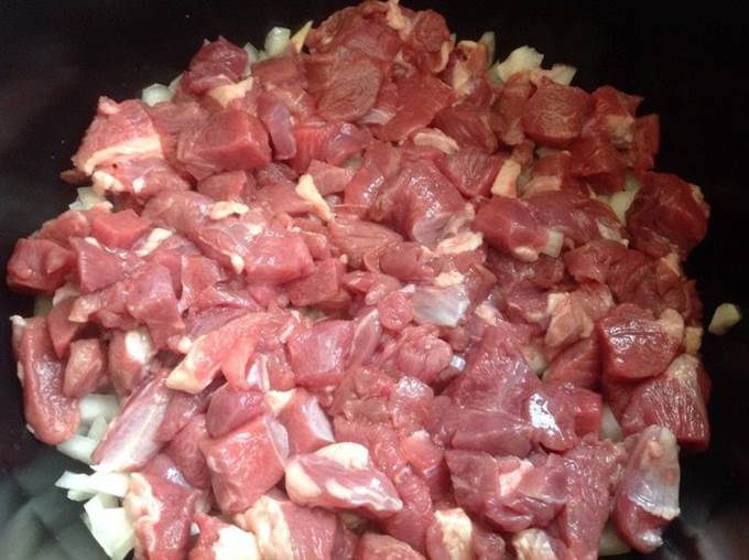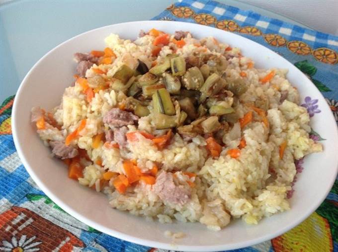 Дальше можно готовить двумя способами: продолжать готовить в сковороде или готовить в мультиварке. Выровнить слой мяса, выложить слоями морковь, цветную капусту и рис.