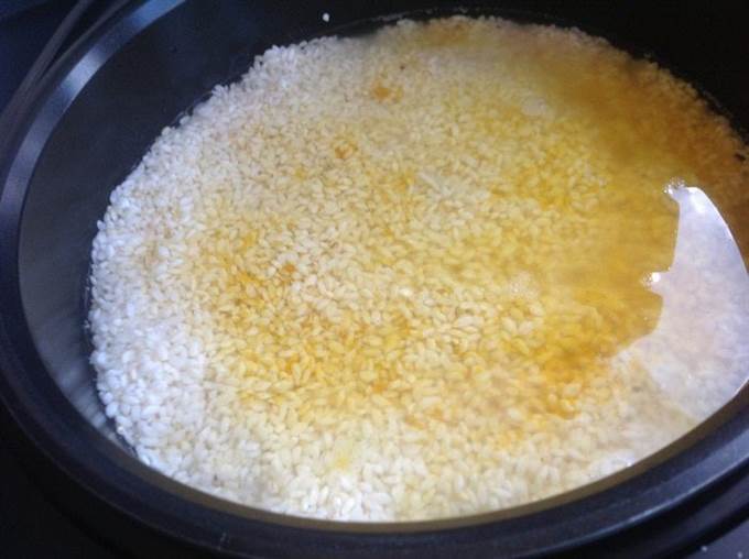 Залейте 1 л воды, присыпьте куркумой, уменьшите огонь, накройте крышкой и варите, пока не выпарится вся вода. Если вы будете готовить в мультиварке, то установите программу «Плов» и время 45 минут.