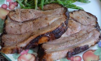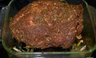 Достанем из холодильника. Дадим постоять при комнатной температуре 1 час. Поставим в разогретую духовку на 180 гр., в жаропрочном блюде. Выпекаем 2 часа. За 30 минут до готовки, можно прикрыть фольгой.