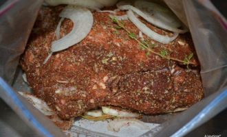 Смешаем заранее в пакете все перечисленные ингредиенты кроме свинины. Положим в пакет кусок свинины (лопаточно-шейный отруб) и дадим полностью покрыть его специями.